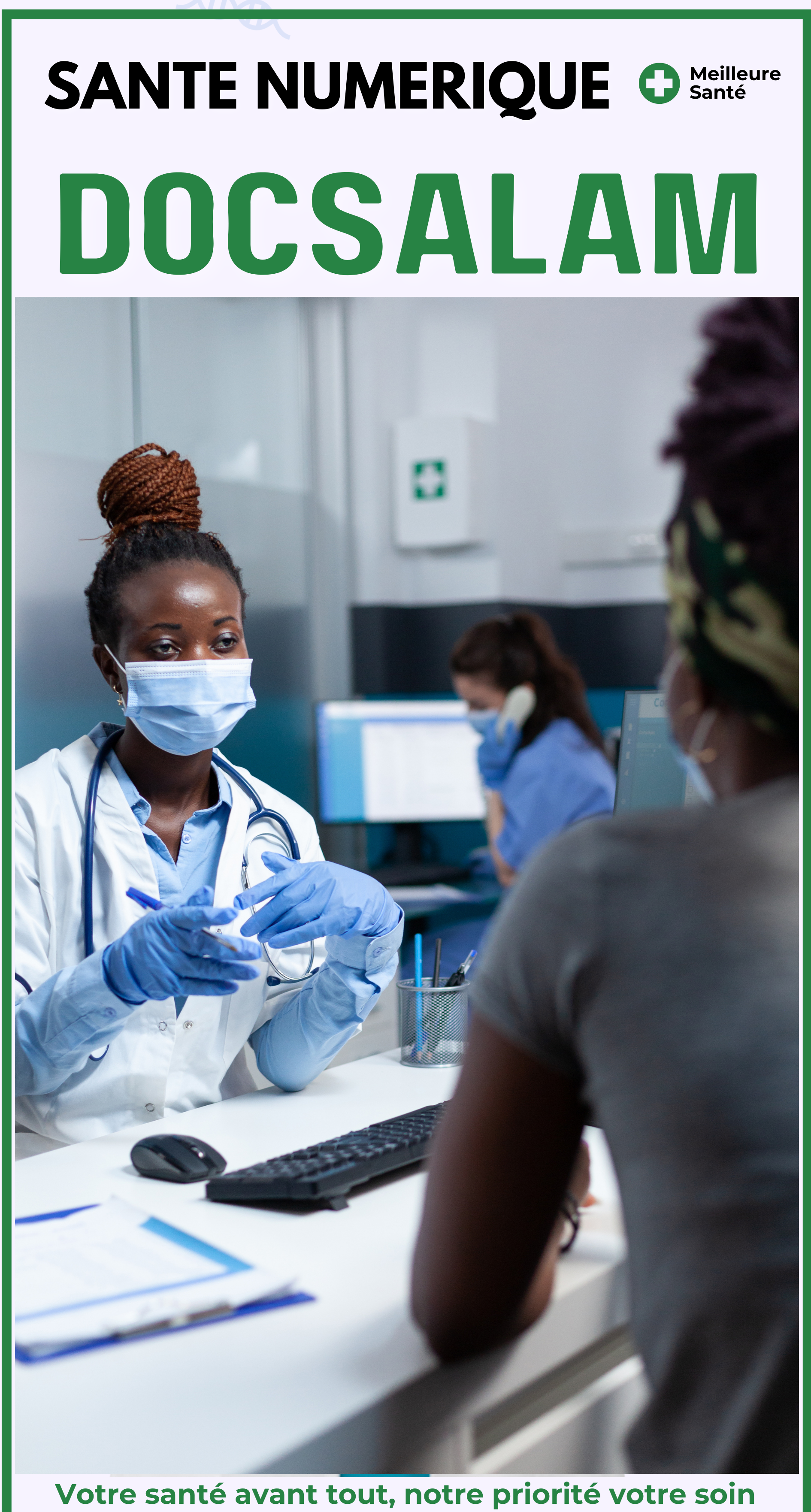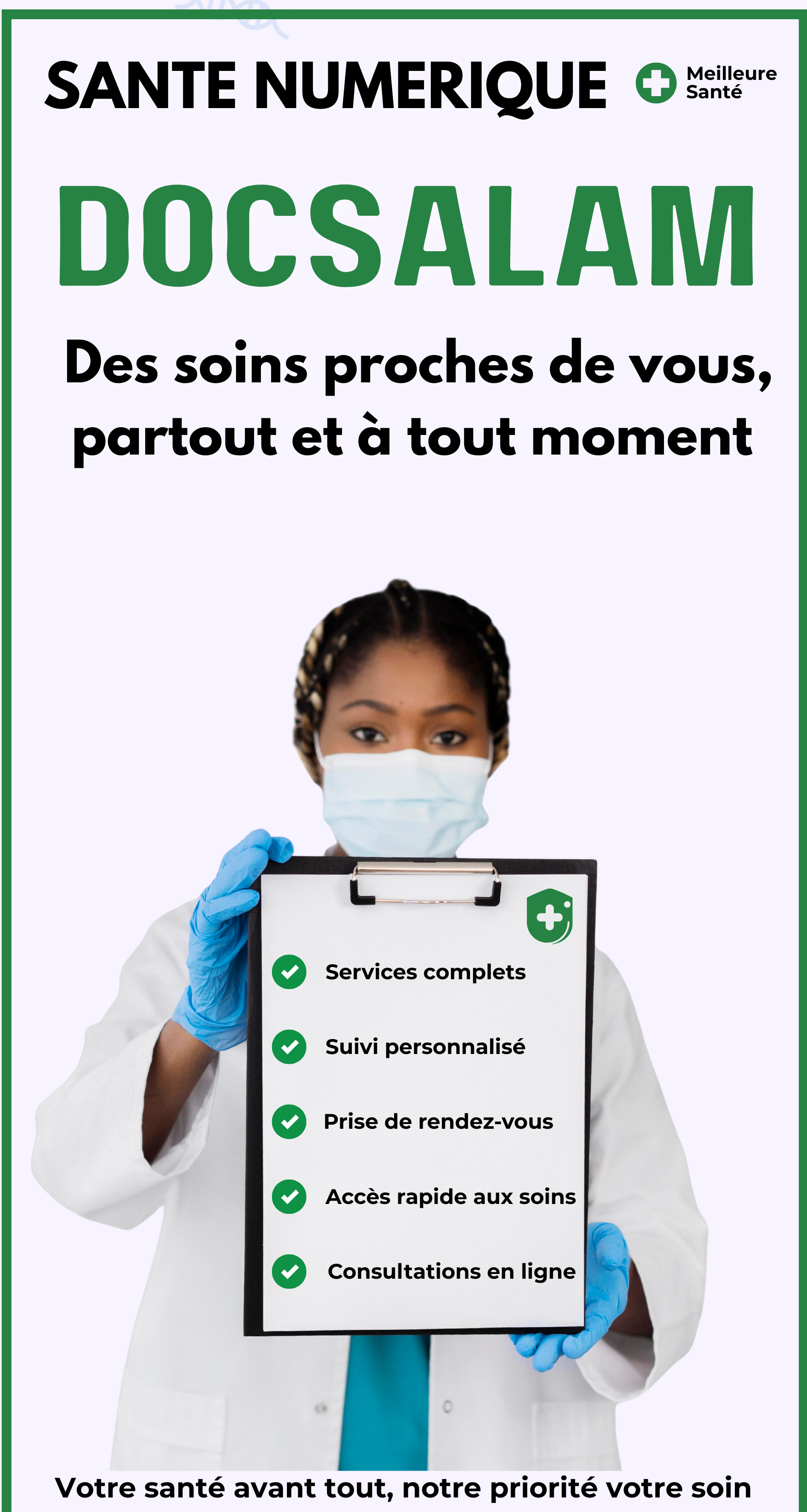 Vivez une expérience médicale simple et rapide. Avec DocSalam, consultez des médecins certifiés, obtenez des conseils et prenez rendez-vous en quelques clics, où que vous soyez.
